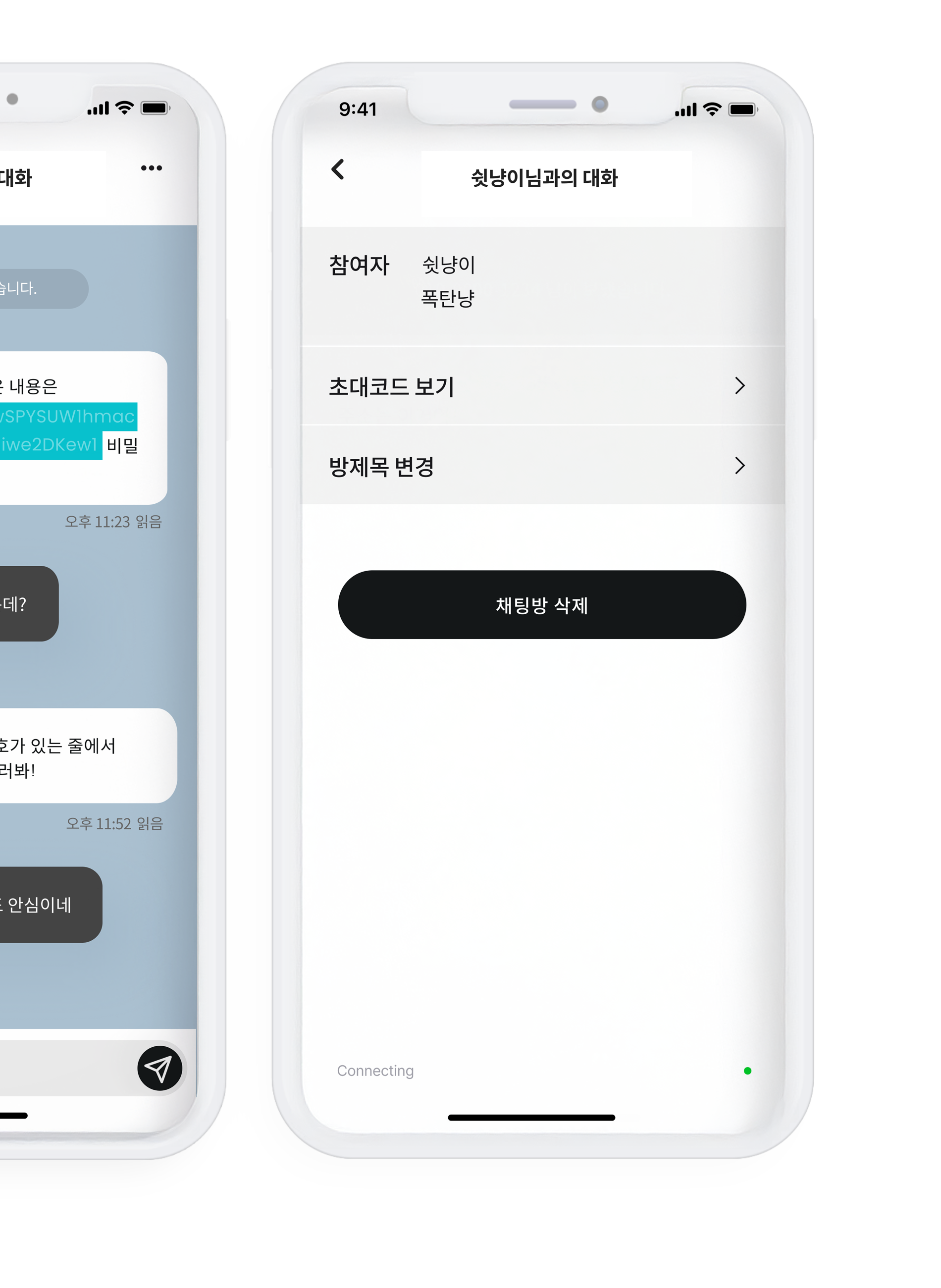 설정의 [채팅방 삭제]를 누르면 나와 상대방의 대화가 모두흔적없이 사라집니다. 대화 목록의 메시지도 24시간 후 자동으로 사라집니다.